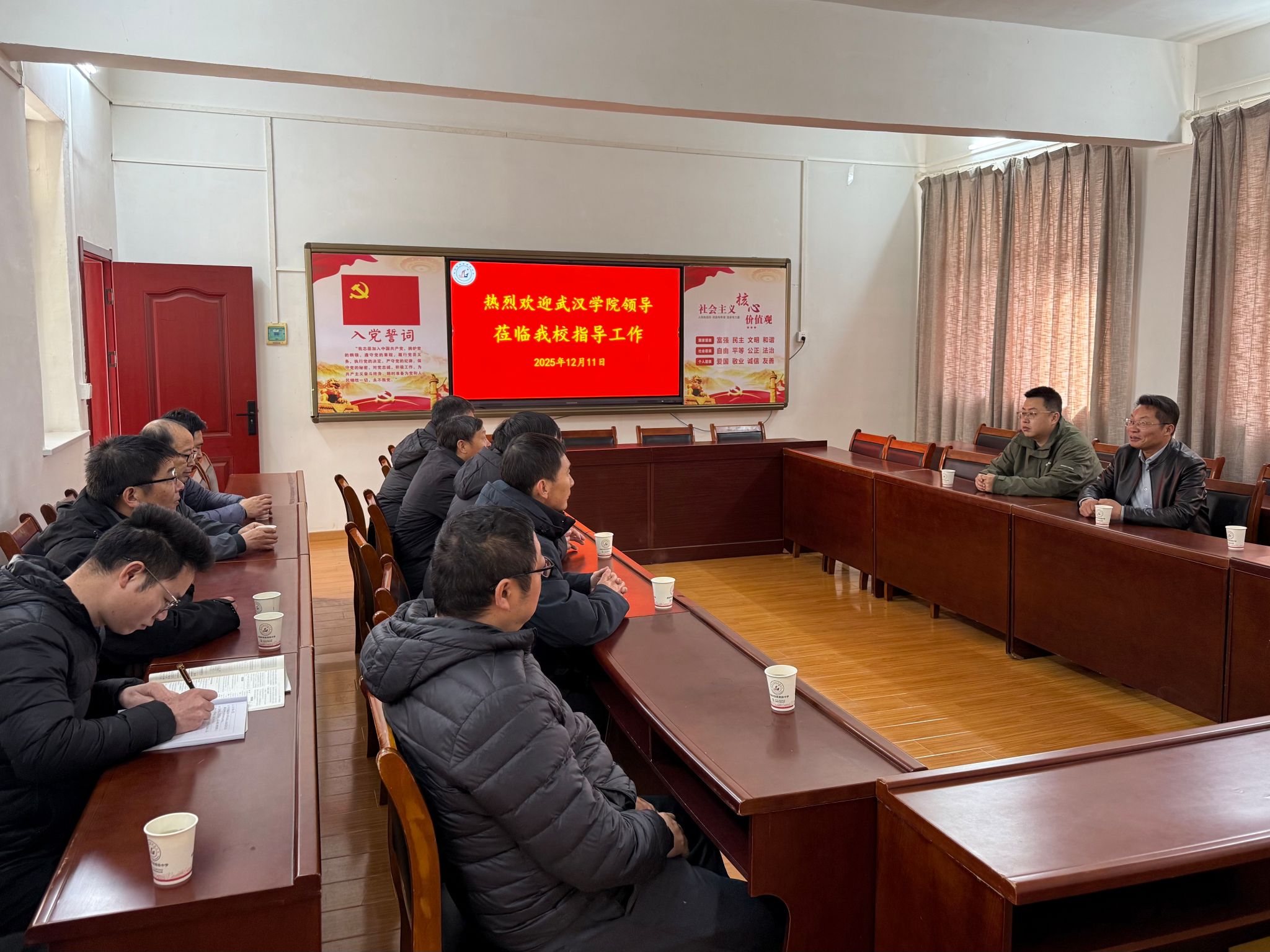随后,工作组抵达麻城二中,与施胜林校长进行了卓有成效的交流。双方重点就2025年的招生情况进行了回顾与总结,并就2026年的招生政策新动向、志愿填报指导等事宜交换了意见。陈斌对我校近年来的录取分数线、专业优势及校园文化生活进行了补充说明。施胜林校长表示,武汉学院作为一所快速发展的应用型民办大学,特色鲜明,前景广阔,今后将鼓励更多契合我校特色的优秀学生关注并报考。